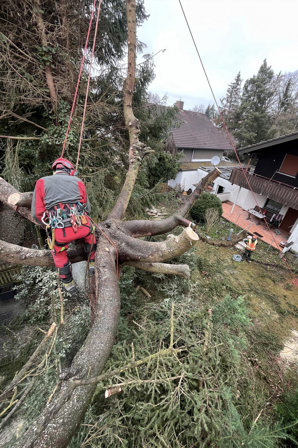 Bäume müssen manchmal aus Sicherheitsgründen gefällt werden. Im städtischen Raum stellt dies aufgrund der beengten Verhältnisse eine große Herausforderung dar. Wir sind Spezialisten für Baumfällungen mittels Seilklettertechnik.